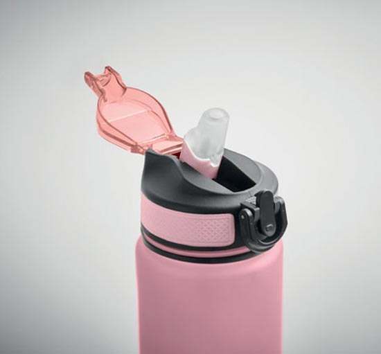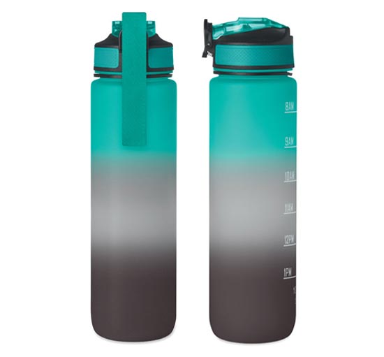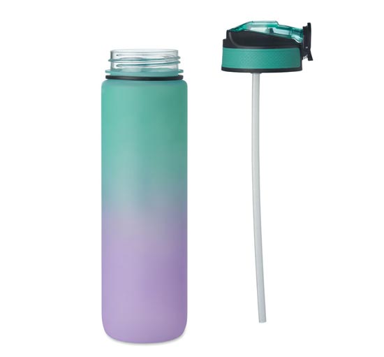 Υλικό κατασκευής: Αθλητικό μπουκάλι νερού από RPET με ενσωματωμένο καλαμάκι, μαλακό επιστόμιο σιλικόνης, σημάνσεις χρόνου με κίνητρα, καπάκι που ανοίγει με το ένα χέρι, κλειδαριά ασφαλείας και ιμάντα μεταφοράς.