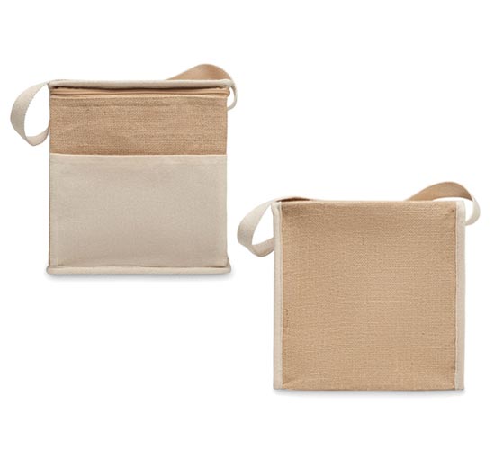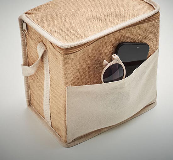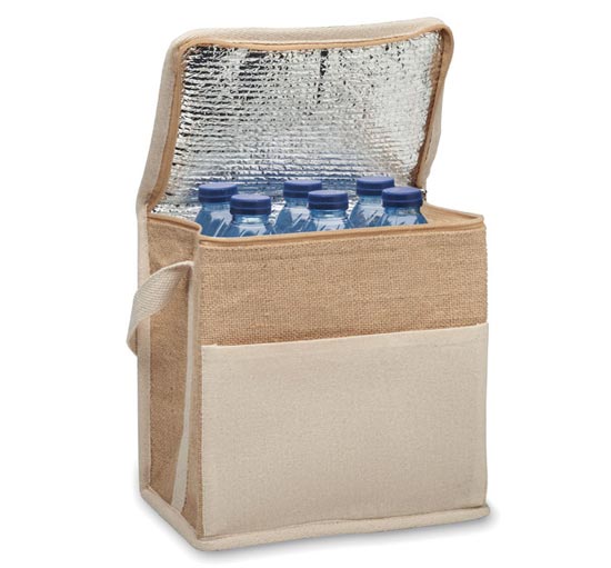 Ισοθερμική Τσάντα ψυγείου από γιούτα με βαμβακερό λουράκι και μπροστινή τσέπη για 6 φιάλες των 0,5 L. Υλικό μόνωσης: aluminium foil 3 mm.
